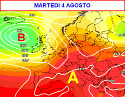 La terza cartina a lato, valida per martedì 4 agosto, ci mostra l’alta pressione ben salda sull’Italia e il bacino del Mediterraneo. Quasi inutile rimarcare che con questa situazione il sole trionferà nuovamente da nord a sud sullo Stivale; i termometri punteranno inevitabilmente al rialzo con condizioni di caldo fastidioso su molte regioni.
