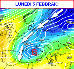 A seguire cosa potrebbe succedere? Dopo un fine settimana complessivamente buono con un clima non particolarmente freddo, ma ventoso (specie al centro e al meridione) il tempo dovrebbe peggiorare nuovamente sull’Italia nella giornata di lunedi 5 febbraio (seconda mappa).