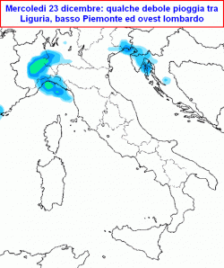 la mappa delle precipitazioni previste tra lunedì 21 e venerdì 25 dicembre: si può notare che gli unici fenomeni si svilupperanno tra Liguria, basso Piemonte, a tratti anche l’ovest lombardo, ma aldilà di qualche locale rovescio a ridosso della fascia costiera, si tratterà di fenomeni di trascurabile entità.