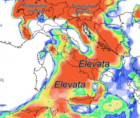 Un potente scambio meridiano riporterà un ultimo tuffo nell’inverno sull’Europa in un periodo ormai decisamente fuori tempo massimo. L’aria artica proveniente dalla Penisola Scandinava conquisterà senza troppi problemi i paesi dell’Europa centrale per poi gettarsi a capofitto sul bacino del Mediterraneo, dando luogo ad un sensibile abbassamento della temperatura. Nell’immediato futuro sono almeno DUE i fronti perturbati previsti attraversare il nostro Paese, il primo si sta già sviluppando in questo momento sui settori di basso Mediterraneo, porterà precipitazioni dalla prossima notte sulle regioni del centro e del sud, particolarmente colpiti i versanti tirrenici. Ecco la previsione del modello americano sulla probabilità della pioggia sull’Italia riferita a sabato pomeriggio: