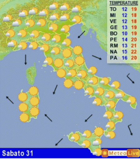 Il fine settimana dei Santi sarà di conseguenza stabile e soleggiato ovunque e con tempetature miti di giorno. Poche le nebbie e pochi gli addensamenti nuvolosi che avranno carattere locale e temporaneo. Di seguito, la situazione prevista per sabato 31 ottobre: