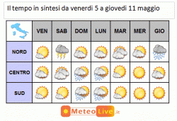 Venerdì di sole, sabato altre piogge in arrivo al nord. Tra domenica e martedì un po' di instabilità a passo per l'Italia, specie su nord-est e dorsale appenninica del centro e del sud. Da mercoledì al nord flusso di aria umida ed instabile e da giovedì a tratti pioggia, altrove aria calda in arrivo dal nord Africa.
