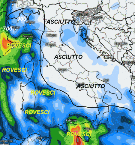 La perturbazione sarà fiaccata nel suo moto verso levante e riuscirà a portare dei rovesci solo sul nord-ovest, sulla Sardegna e sulla Sicilia. Sul nord-ovest anche qualche nevicata sulle Alpi sopra i 700-900 metri.