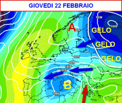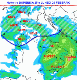 Domenica 25 e lunedi 26 febbraio: probabile neve a carattere di bufera al nord, Toscana, Umbria e Marche, sopra i 300-500 metri altrove, maltempo al sud con temporali forti, molto freddo specie al centro e al nord.
