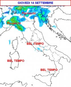 Giovedì 14 e venerdì 15 settembre: tempo da variabile ad instabile al nord e sulla Toscana con rischio di rovesci e locali temporali. Bel tempo sul restante centro e al sud con temperature in progressivo aumento.