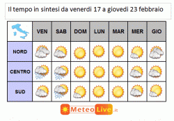 venerdì 17 febbraio: annuvolamenti tra nord e centro, qualche piovasco su estremo nord-est, Emilia-Romagna, rovesci tra Toscana, Umbria, Spezzino, asciutto altrove, ancora prevalenza di sole al sud ma con nubi in arrivo. Temperature minime in rialzo, massime in lieve calo.