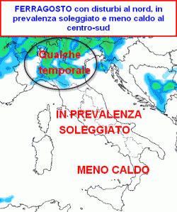 Ci aspetta dunque un Ferragosto con disturbi temporaleschi al nord, qualche annuvolamento in transito al centro e un clima decisamente soleggiato, ma meno caldo, al meridione.