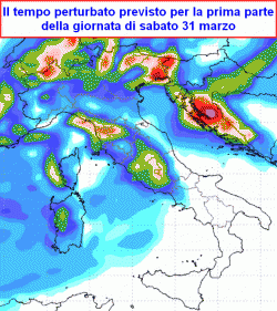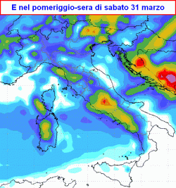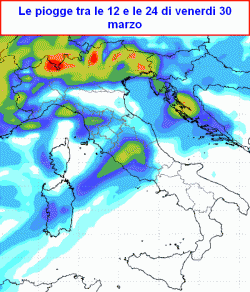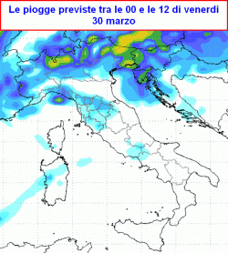 venerdì 30 marzo: piogge su Alpi, Prealpi, pianure a nord del Po, Liguria, a macchia di leopardo su Toscana, Umbria, Lazio, Sardegna, asciutto altrove, soleggiato al sud. Neve sulle Alpi oltre i 1500m.