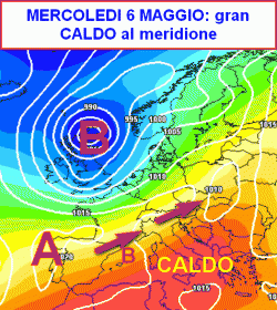 Martedì 5 maggio bel tempo e molto caldo al centro-sud, specie in Sardegna, temporali tra pomeriggio e sera su estremo nord-ovest, sul restante settentrione nubi sparse, ma alternate ad ampie schiarite. Mercoledì 6 maggio molto caldo al meridione, velature o nubi alte in arrivo al centro, qualche temporale su Alpi, Prealpi, alto Veneto e Friuli. Giovedì 7 e venerdì 8 maggio in genere soleggiato e meno caldo su tutta l’Italia, peggiora venerdì sera al nord, ad iniziare da ovest, con temporali. Sabato 9 e domenica 10 maggio correnti fresche settentrionali interesseranno la nostra Penisola con una generale rinfrescata e possibili fenomeni di instabilità in marcia da nord vero sud. Lunedì 11 maggio fenomeni di instabilità residui al sud e sul basso Adriatico, torna il sole e il bel tempo altrove.