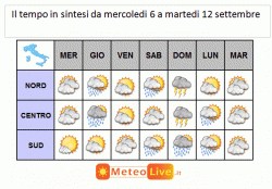 domenica 10 settembre: al nord e al centro perturbato con piogge e temporali, anche forti su Tirreno e regioni di nord-est, poi miglioramento al nord-ovest; al sud peggiora con temporali sulla Campania, al mattino parzialmente nuvoloso e caldo sulle restanti zone del sud ma in peggioramento dal pomeriggio con rovesci e temporali. Ventoso ovunque, calo termico in coincidenza con il passaggio frontale.
