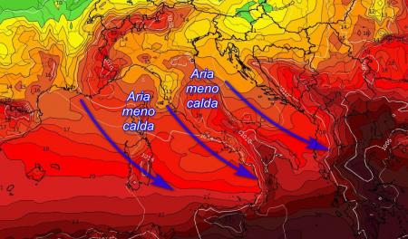 Tra giovedì 1 luglio e venerdì 2, grazie a una piccola "spintarella" offerta dall’alta pressione delle Azzorre in rimonta sul’ovest Europa, l’aria fredda raggiungerà anche il sud. Su questo settore d’Italia le temperature entro venerdì scenderanno di alcuni gradi ed anche qui si farà sentire la spinta di una ventilazione tesa di Maestrale. Su queste regioni il calo termico sarà accompagnato anche da qualche nube in più, con il rischio di qualche episodico temporale sui rilievi.Temperature previste dal modello americano alla quota di circa 1500 metri giovedì 1 luglio