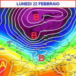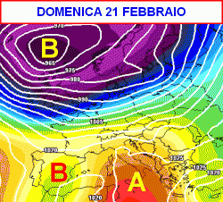La seconda cartina, valida per domenica 21 febbraio, ci mostra l’alta pressione distesa dal nord Africa fino al settore centro-meridionale italico. Da ovest altre perturbazioni penetreranno verso la nostra Penisola, determinando un successivo cambiamento.