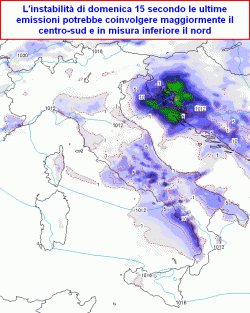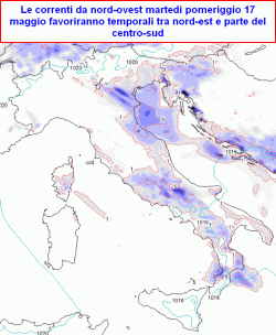 domenica 15 maggio: residua instabilità su basso Veneto, bassa Lombardia ed Emilia-Romagna con brevi precipitazioni pomeridiane, instabile al centro con rovesci sparsi e temporali alternati a schiarite, variabile su meridione peninsulare con qualche breve temporale o rovescio sparso, specie a ridosso dei rilievi, più sole in Sicilia e Sardegna con Maestrale già teso. Temperature ancora fresche al centro, in moderato rialzo al nord-ovest, stazionarie altrove.