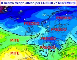 Il medesimo corpo nuvoloso, spostandosi verso levante, sarà seguito da aria fredda che tra domenica 26 e lunedi 27 novembre irromperà su quasi tutto il centro-nord causando una diminuzione delle temperature (prima mappa).