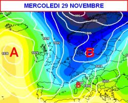 C’è ancora molta incertezza in merito alla posizione del minimo barico da contrasto che si formerà sul Mediterraneo. L’ultimo aggiornamento modellistico per mercoledi 29 novembre lo pone tra la Liguria e la Toscana.