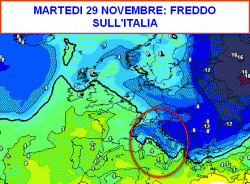 La prima mappa mostra il momento culminante di questa veloce ondata fredda, ovvero la mattinata di martedì 29 novembre. Si tratta delle temperature previste a 1500 metri di quota.