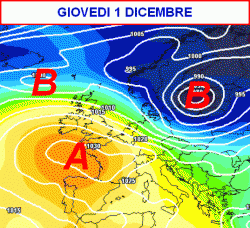 La seconda mappa, valida per giornata di giovedì 1 dicembre, mostra la "bestia nera" dell’inverno italico, ovvero l’alta pressione atlantica in "spanciamento" sull’Europa.
