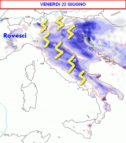Venerdì 22 giugno peggiora al nord-est, medio/alto Adriatico e zone interne del centro durante il pomeriggio con temporali anche forti; per il resto nubi sparse e tempo asciutto, temperature in calo sotto i rovesci.