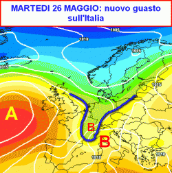 La seconda cartina inquadra la situazione attesa in Italia per la giornata di martedì 26 maggio. Oltre all’alta pressione delle Azzorre sempre defilata in Oceano e con inequivocabili velleità nordiche, si nota una nuova minaccia instabile in arrivo dall’Europa centrale. Il corridoio depressionario passante per il Mediterraneo agevolerà la discesa del nucleo fresco in direzione del Mare Nostrum, determinando un nuovo peggioramento del tempo ad iniziare dalle regioni settentrionali.