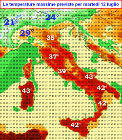 martedì 11 luglio: al nord variabilità con locali rovesci o brevi temporali, specie a ridosso delle montagne e temperature nel complesso sopportabili, tranne sull’Emilia-Romagna dove si toccheranno ancora picchi di 34-35°C, soleggiato e caldissimo al centro-sud con punte di 43°C.