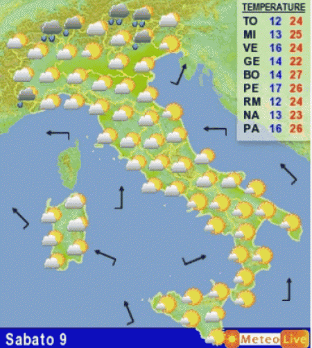 Sabato 9 e domenica 10 maggio tempo abbastanza buono in Italia con nubi in prevalenza medio-alte ed ampie zone di cielo sereno. Solo sulle Alpi si avrà qualche rovescio. Temperature piuttosto elevate.