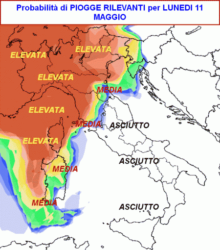 La probabilità viene giudicata ELEVATA su quasi tutto il nord, parte della Toscana; MEDIA sulla Sardegna oltre all’Umbria e all’alto Lazio. Tempo ASCIUTTO e anche abbastanza caldo sul resto d’Italia.
