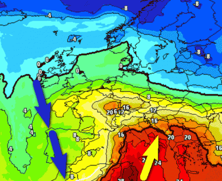 E’ evidente la risalita calda (freccia gialla) che colpirà in pieno le regioni meridionali e in parte anche il centro con valori termici al suolo anche superiori a 30°. Il nord dovrebbe essere escluso da questo abbraccio caldo e potrebbe avere delle piogge specie sul nord-ovest.