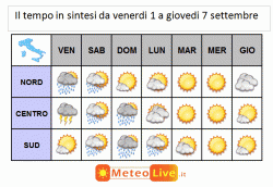 venerdì 1 settembre: al mattino presto temporali al nord e sulla Toscana, rovesci su Umbria e Lazio, poi localizzazione dei fenomeni sul nord-est e schiarite altrove, ancora nulla al sud. In serata nuovi temporali al nord a partire da ovest. Temperature in moderato calo.
