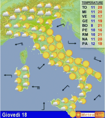 Giovedi 18, venerdi 19 e sabato 20 aprile: bel tempo e clima molto mite su tutta l’Italia. Qualche nube nel pomeriggio potrebbe orlare i rilievi, solo occasionalmente associata a qualche locale rovescio.