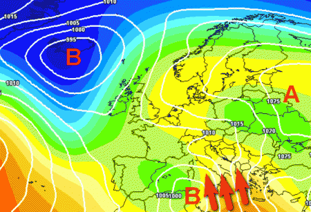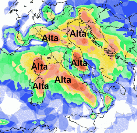 Tutta l’Italia, forse escluso l’estremo sud e l’estremo nord, dovrebbe essere sotto piogge più o meno intense; la probabilità che questo evento accada risulta più alta nelle zone colorate in rosso, media nelle zone contrassegnate dal colore verde, bassa o nulla altrove.