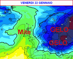 La prima cartina, valida per le ore centrali di venerdì 22 gennaio, ci mostra il vasto lago gelido che campeggerà su buona parte dell’Europa centro-orientale. Al suo interno saranno presenti isoterme localmente inferiori a -15° a 1500 metri di quota circa.