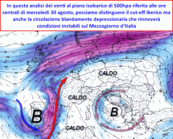 una circolazione debole di bassa pressione segnatamente alle quote superiori, laddove ritroveremo una sorta di "goccia" d’aria più fresca che dai Balcani si porterà a ridosso delle coste meridionali adriatiche.