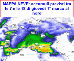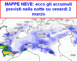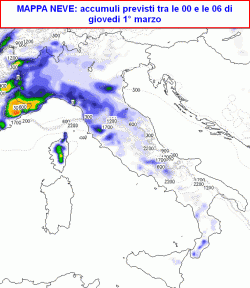 giovedì 1° marzo: risveglio bianco sino in pianura e sulla costa su tutto il nord-ovest e sulla Toscana, l’Umbria, le zone interne del Lazio, Marche, Abruzzo, Lucania, forse anche nord Puglia, asciutto sul resto del nord e sulle zone non citate. Temperature minime in generale aumento. Nel corso della giornata tutta pioggia al centro, asciutto al sud e mite, al nord neve sino in pianura, salvo sulla costa romagnola. Fiocchi più generosi su Emilia, Liguria, bassa Lombardia. In serata temporanea pausa sul nord-ovest, ancora un po’ di neve su nord-est ed Emilia. Temperature massime in calo al nord, in aumento altrove, molto sensibile sulla Sicilia.