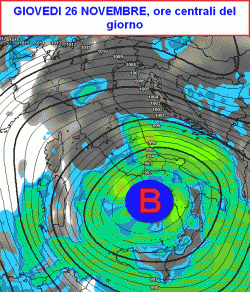 La prima cartina inquadra la situazione barica attesa in Italia nelle ore centrali di giovedì 26 novembre.