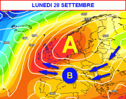 La prima cartina inquadra la situazione sinottica attesa in Europa per le ore centrali di lunedì 28 settembre. Fa quasi impressione l’imponente struttura altopressoria ubicata in sede scandinava; sul bordo meridionale di questo anticiclone prenderanno piede correnti fresche (se non addirittura fredde) dai quadranti orientali che trasporteranno un nucleo instabile verso le regioni settentrionali (cerchio blu).