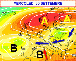 Tale contrasto darà luogo ad una vasta depressione sui settori occidentali del Mediterraneo foriera di piogge e temporali per diverse regioni della nostra Penisola.