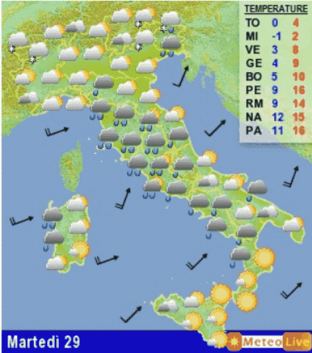 RIASSUMENDO: tra martedi 29 e mercoledi 30 dicembre maltempo sul Tirreno, nelle aree interne e in parte al nord-est con piogge e rovesci sparsi. Neve in Appennino sopora gli 800-1000 metri. Su tutte le altre regioni fenomeni scarsi. Freddo al nord, poco freddo al centro e al sud.
