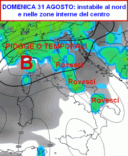 Domenica 31 agosto: maltempo al nord con piogge e temporali sparsi. Instabile nel pomeriggio al centro con possibili temporali, ancora soleggiato sul resto d’Italia.