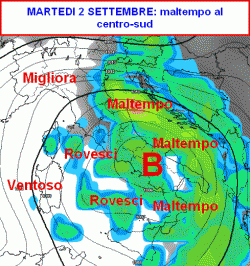 Martedì 2 settembre: maltempo al centro-sud con temporali, vento forte e calo delle temperature, migliora al nord (questa previsione necessita di conferme).
