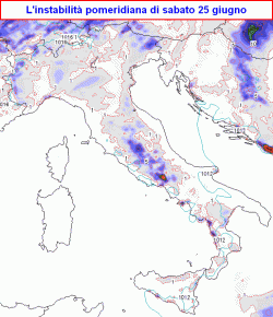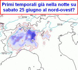 sabato 25 giugno: tra la notte ed il mattino presto possibili temporali locali sul nord-ovest, specie su ovest Lombardia, poi parziali schiarite ma nel pomeriggio nuova attivazione della tendenza a temporali sparsi, più probabili a ridosso dei rilievi e verso sera. Locali temporali anche a ridosso di tutta la dorsale appenninica, in particolare sul settore laziale. Temperature in diminuzione.