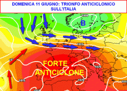 La fase culminante dell’anticiclone si toccherà tra sabato 10 e lunedì 12 giugno (la seconda mappa si riferisce a domenica 11 giugno).