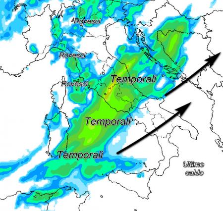 Lunedì 31 un nuovo corpo nuvoloso si sviluppa sul Mediterraneo, con temporali intensi sulle regioni centrali ed al nord-est. Qualche temporale anche al sud. Calo termico generale.