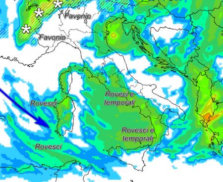 Giovedì 24 peggiora in giornata al centro ed al nord, con precipitazioni anche intense su versanti tirrenici e lungo la fascia alpina, temporanea impennata termica al sud.