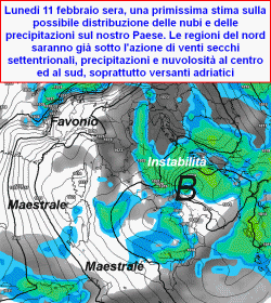 Una perturbazione più organizzata farà breccia sul bacino centrale del Mediterraneo tra la serata di domenica è la giornata di lunedì 11 febbraio. Domenica sera qualche precipitazione è prevista sulle regioni settentrionali, nelle prime ore di lunedì 11 febbraio i fenomeni tenderanno però a trasferirsi velocemente verso le regioni centrali e meridionali. Al nord è prevista una veloce rotazione del vento dai quadranti settentrionali che in breve tempo sarà in grado di estendersi a tutto il Paese e sarà associata ad un calo termico. Tra martedì e mercoledì prossimo, i fenomeni di instabilità saranno ormai circoscritti alle regioni adriatiche meridionali, mentre su tutte le altre regioni è prevista una rotazione più convincente del vento dai quadranti nord-orientali, associata ad una riduzione più sensibile del quadro termico generale.