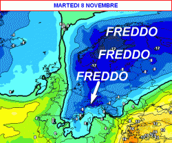 La mappa relativa alle temperature a 1500 metri prevista per martedì 8 novembre mostra isoterme attorno a -10/-12° alla medesima quota nelle zone contrassegnate dal blu scuro.