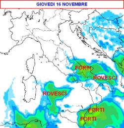 Giovedì 16 novembre: tempo ancora perturbato in Abruzzo e al meridione con piogge anche intense specie sui settori ionici. Bel tempo o nubi di poco conto altrove.