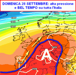 Sabato 27, domenica 28 e lunedì 29 settembre: bel tempo e abbastanza caldo su tutta la Penisola. Eventuali addensamenti avranno carattere temporaneo e non saranno associati a piogge. Venti deboli.