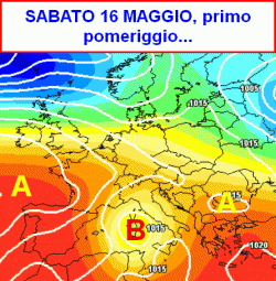Venerdì 15 maggio maltempo al nord con temporali anche forti e temperature in calo. Qualche rovescio anche su Toscana, Umbria e nord Marche nel pomeriggio, per il resto nubi sparse senza fenomeni. Sabato 16 maggio instabile sulla Sardegna e in misura minore in Adriatico e al nord, nubi sparse altrove senza precipitazioni, calo termico generalizzato. Domenica 17 maggio instabile al sud con qualche temporale, migliora al centro-nord. Lunedì 18, martedì 19 e mercoledì 20 maggio tempo abbastanza buono sull’Italia salvo incertezze lunedì al sud e mercoledì al nord. Giovedì 21 maggio peggiora al nord con temporali, invariato altrove.