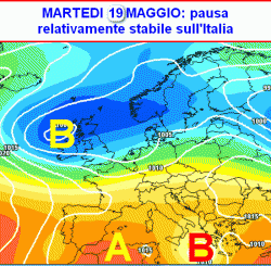 La seconda figura a lato ci mostra la situazione attesa sul nostro Paese nelle prime ore di martedì 19 maggio. La nostra Penisola vivrà una breve fase soleggiata ubicata tra due distinte zone depressionarie. Della prima abbiamo già parlato (si tratterà del residuo della goccia fredda che ci interesserà nel fine settimana).