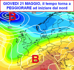 L’alta pressione sul Mediterraneo non reggerà e la sopracitata depressione tenderà a scendere di latitudine, promuovendo una vasta saccatura che nella giornata di giovedì 21 (terza cartina a lato) potrebbe determinare un nuovo peggioramento sull’Italia, ad iniziare dalle regioni settentrionali.